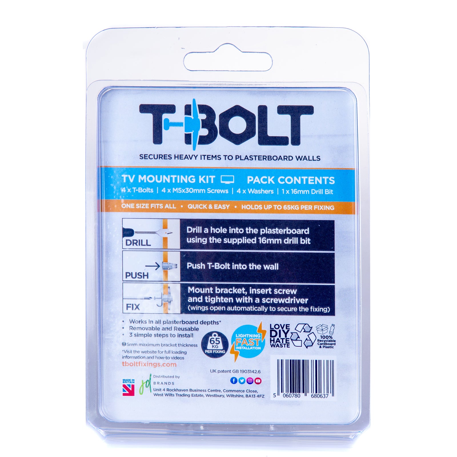 T-Bolt is a revolutionary new plasterboard fixing. Its straightforward & lightning fast to install, this fixing works in all depths of plasterboard. A unique depth washer ensures the fixing cannot be overtightened, and the automatic wing deployment gives peace of mind it is correctly fitted.